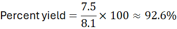 Problem: The theoretical yield of sodium chloride from 5 g Na reacting with Cl₂ is 8.1 g. If the actual yield is 7.5 g, calculate the percentage yield.