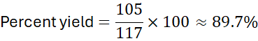 Problem: Industrial reaction of 100 g N₂ with excess H₂ theoretically produces 117 g NH₃. Actual yield = 105 g. Calculate percent yield.
